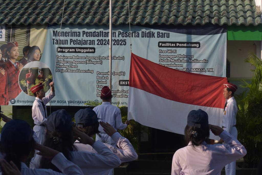 Senin, 15 Juli 2024 SMP BOPKRI 1 Yogyakarta melaksanakan upacara bendera untuk mengawali kegiatan pada awal tahun pembelajaran 2024/2025. Upacara bendera adalah kegiatan yang rutin dilaksanakan pada hari Senin atau hari-hari besar. Upacara bendera kali ini terasa lebih istimewa karena dilaksanakan pada awal tahun ajaran baru dan diikuti oleh peserta didik baru, kelas VII. Kegiatan ini juga diikuti oleh peserta didik kelas VIII, kelas IX, seluruh jajaran guru, dan karyawan SMP BOPKRI 1 Yogykarta. Rangkaian kegiatan upacara diisi juga dengan penyerahan siswa baru kelas VII dari panitia PPDB kepada sekolah. Kegiatan tersebut ditandai dengan penandatanganan berita acara oleh kepala sekolah.